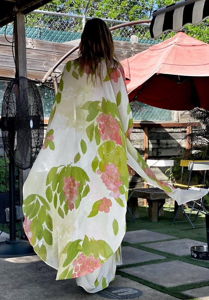 The Erte Kaftan Hydrangea is the kaftan of ‘101 options to wear’. Tie up the front for a shirt, wear over your favorite swimsuit, dress, shorts or pants. The French Hydrangea print was inspired by Arianne’s love of the flower’s waterfall of coral pink and chartreuse color.