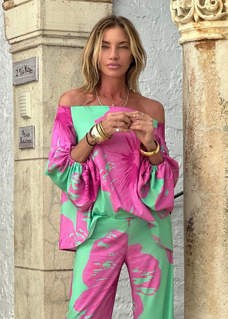 The Briana Top from Ramona La Rue is a must-have among devoted fashionistas. The design takes inspiration from the vibrant 70's era. Get the complete look by pairing it with our alluring signature pants in magenta hibiscus. Each piece features a distinct and captivating print.