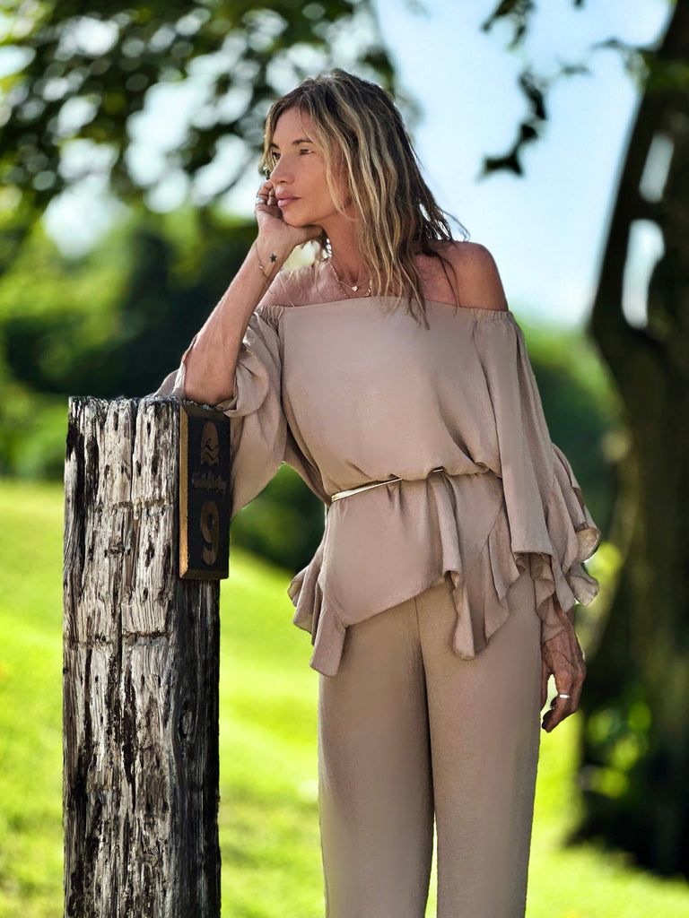 Introducing the Lucy Top in taupe- the ultimate trendsetter's choice! This off-the-shoulder silhouette features charming ruffles on the sleeves and hem, while the double-lined body and single lined sleeves offer a breezy contrast. Complete the look with the Lucy Pants for a stylish and coordinated outfit.