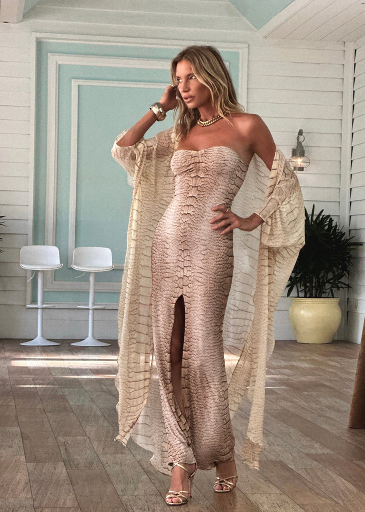 Crafted from figure-enhancing ITY fabric, the Santana Dress exudes sophistication and allure. This impeccable strapless Alligator dress in classic black features a tantalizing front split and subtle ruching that creates an undulating silhouette. The effortless pull-on design makes this piece a quintessential choice for distinguished occasions.